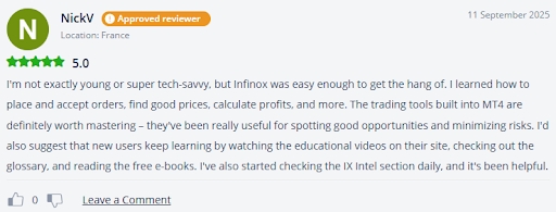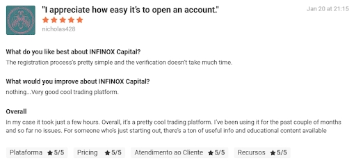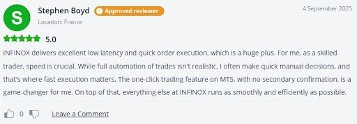 One can easily come across INFINOX broker reviews written by skilled traders. They confirm that this broker has created a comfortable environment for them. In particular, this user praises one-click trading and fast execution, which lets them seize the moment.