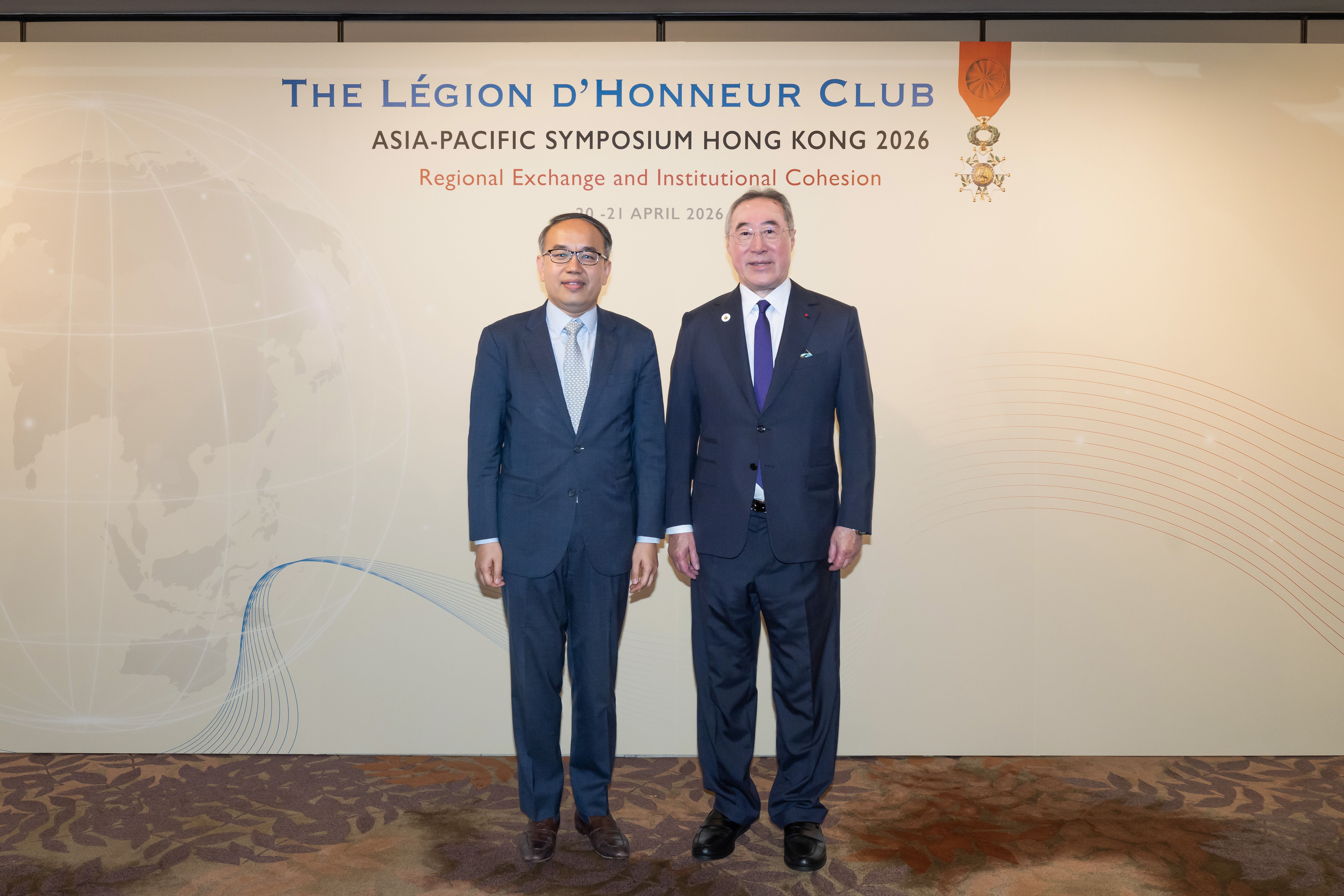 The inaugural Asia-Pacific Symposium, titled Regional Exchange and Institutional Cohesion, was held today. Chan Kwok-ki, Chief Secretary for Administration of the HKSAR Government, Admiral Alain Coldefy, President of the Society of Members of the Legion d’Honneur, and Christile Drulhe, Consul General of France in Hong Kong and Macau, officiated at the event. In addition, Christopher Hui, Secretary for Financial Services and the Treasury of the HKSAR Government, shared with participants, including representatives from Australia, France, the Philippines, and Thailand, the development of Hong Kong as an international financial centre. (Photo 1, 2 & 3)