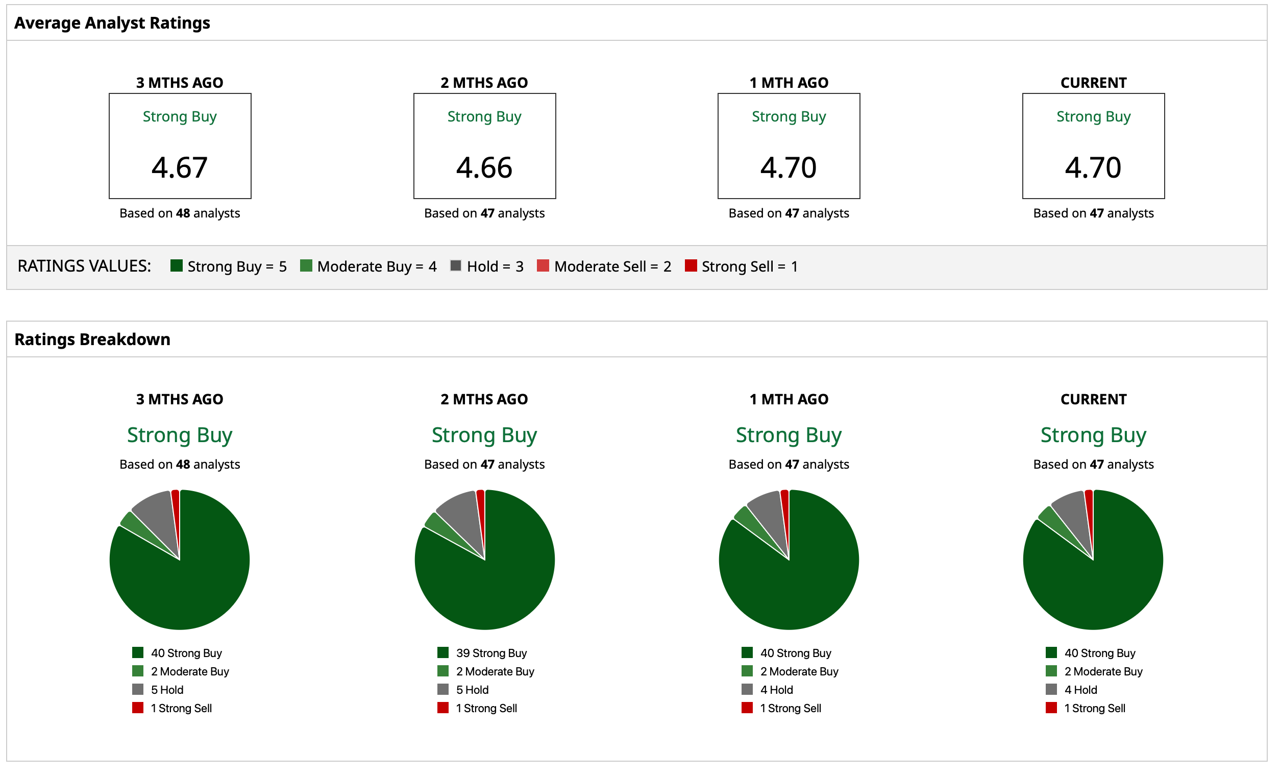 Overall, analysts have deemed the NVDA stock a “Strong Buy” with a mean target price of $225.86. This indicates an upside potential of about 10% from current levels. Out of 47 analysts covering the stock, 40 have a “Strong Buy” rating, two have a “Moderate Buy” rating, four have a “Hold” rating, and one has a “Strong Sell” rating.