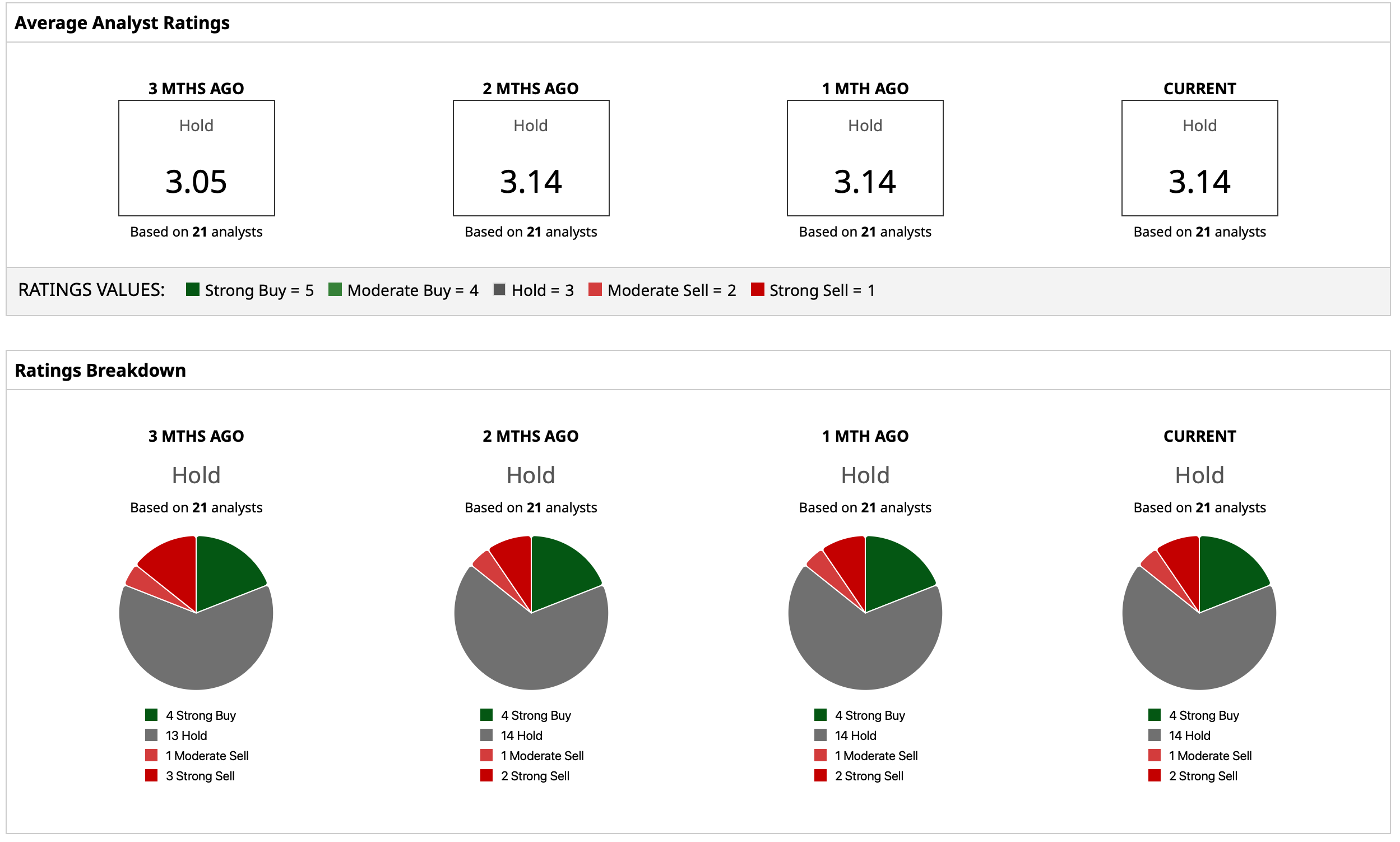 For PLTR stock, analysts are a bit less enthusiastic (thanks to its punchy valuations), having earmarked a rating of “Hold.” With the mean target price already surpassed, the high target price of $215 indicates an upside potential of about 4% from current levels. Out of 21 analysts covering the stock, four have a “Strong Buy” rating, 14 have a “Hold” rating, one has a “Moderate Sell” rating, and two have a “Strong Sell” rating.