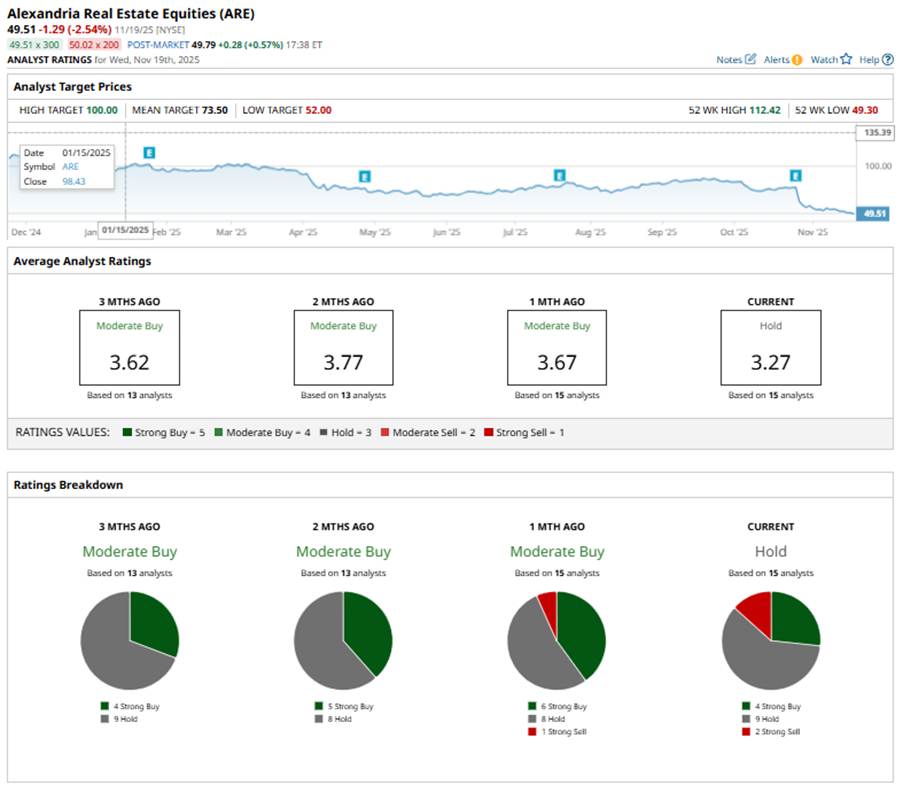 Recently, Citizens downgraded ARE to “Market Perform” after weak Q3 2025 results. Supply pressures in key markets, slowing Life Science capital flows, and concerns about leasing added to the cautious stance.