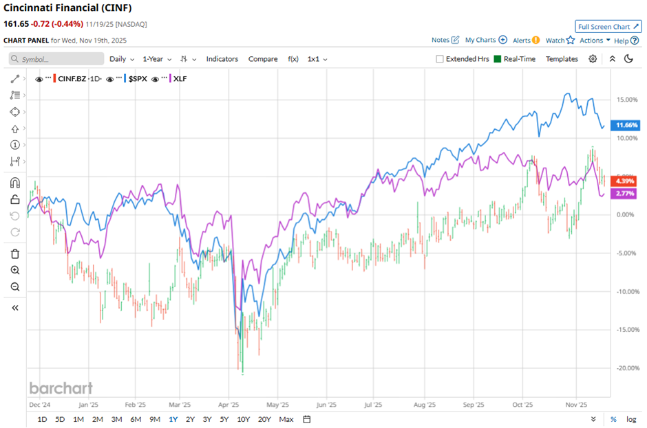Shares of the Fairfield, Ohio-based company have lagged behind the broader market over the past 52 weeks. CINF stock has risen 7.4% over this time frame, while the broader S&P 500 Index ($SPX) has rallied 12.3%. In addiiton, shares of the company are up 12.5% on a YTD basis, compared to SPX’s 12.9% gain.