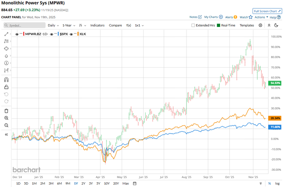 With a market cap of $42.4 billion, Monolithic Power Systems, Inc. (MPWR) is a fabless semiconductor company that designs and markets high-performance analog and mixed-signal power solutions used across industrial, automotive, cloud computing, consumer, and communications applications. The company leverages proprietary process technologies and a global customer base spanning the United States, Asia, and Europe.