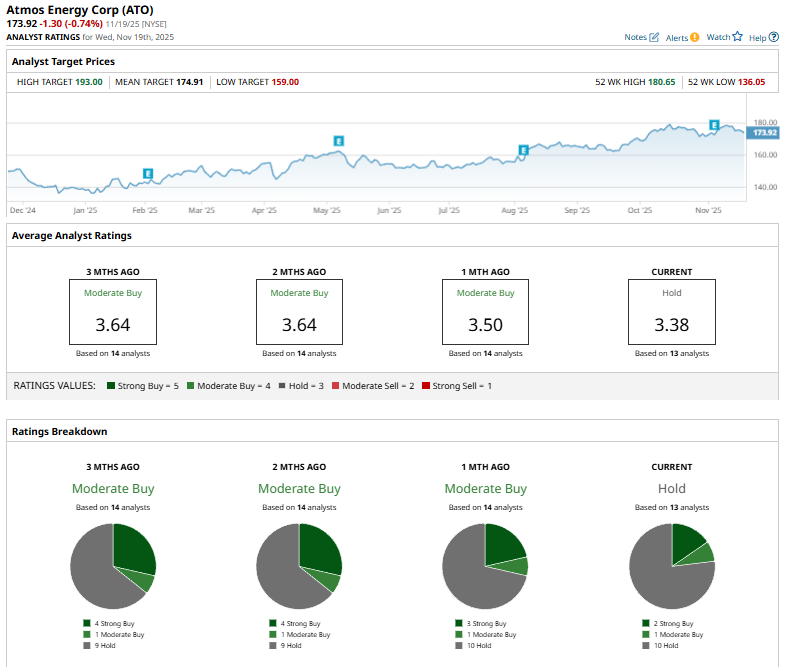 Among the 15 analysts covering ATO stock, the consensus is a “Hold.” That’s based on two “Strong Buy” ratings, one “Moderate Buy,” and ten “Holds.”