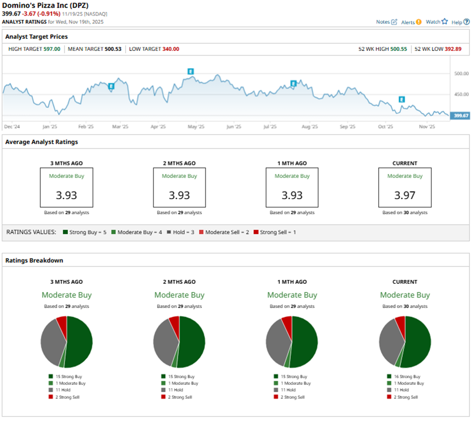 The mean price target of $500.53 represents a premium of 25.2% to DPZ's current price. The Street-high price target of $597 suggests a 49.4% potential upside.