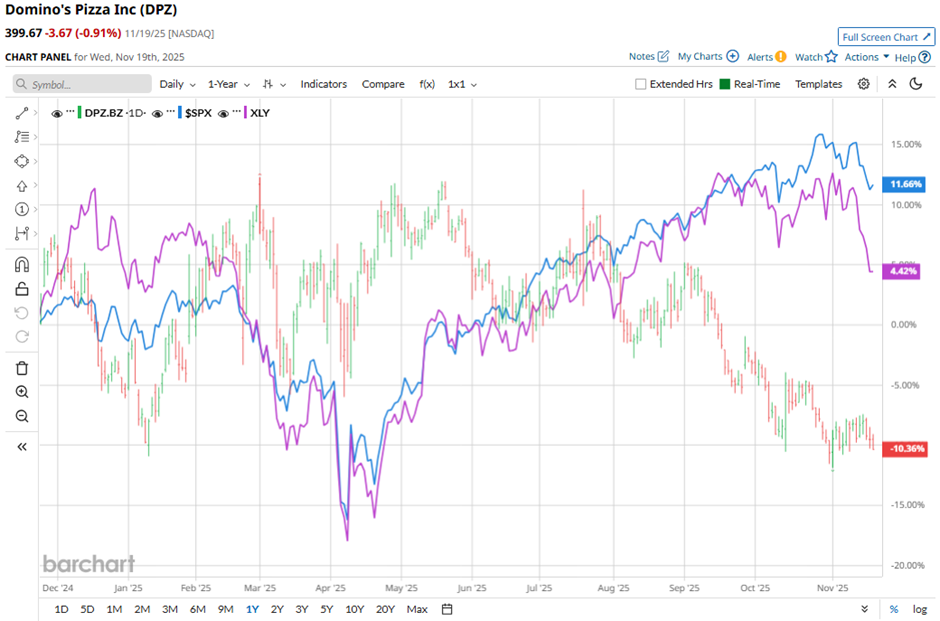 Shares of Domino's Pizza have underperformed the broader market over the past 52 weeks. DPZ stock has fallen 9.1% over this time frame, while the broader S&P 500 Index ($SPX) has rallied 12.3%. Moreover, shares of the company have declined 4.8% on a YTD basis, compared to SPX’s 12.9% gain.