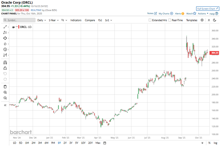 ORCL stock has been on a remarkable tear in 2025, with its trajectory capturing both investor attention and the market’s appetite for AI infrastructure plays. Over the past 52 weeks, shares have vaulted from a low of $118.86 to a high near $345.72, which was reached on Sept. 10 following its first-quarter fiscal 2026 earnings release, reflecting the volatile but powerful upswing in sentiment around its cloud and AI capabilities. ORCL stock is up 46% over the past year.