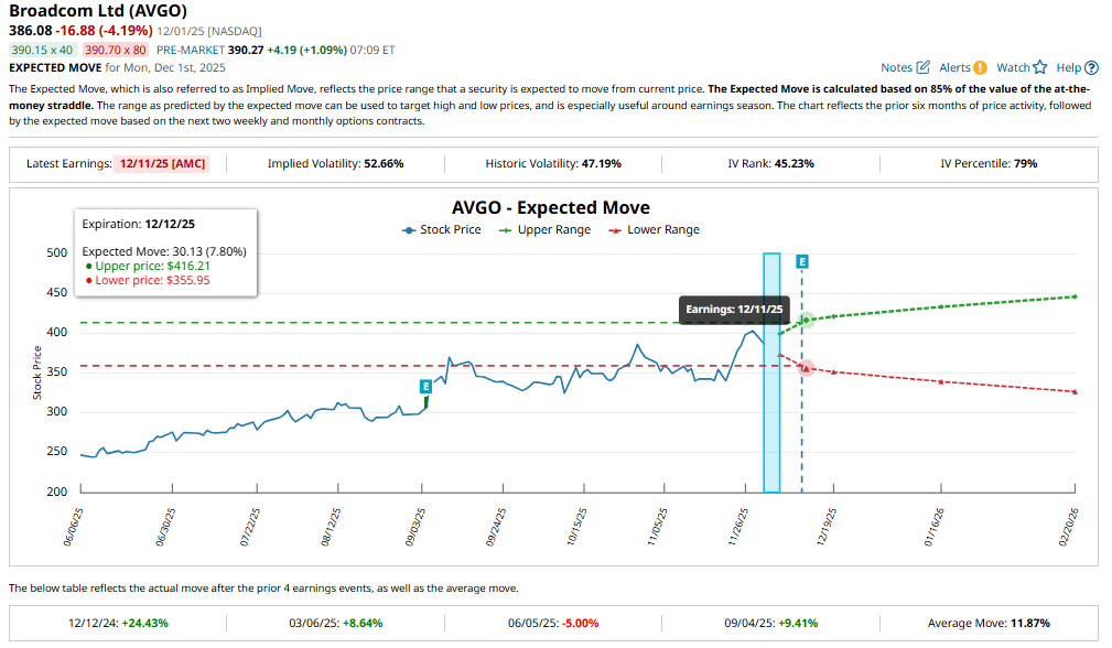With expectations already high for Broadcom, particularly around AI revenue growth, will the upcoming earnings report be strong enough to push AVGO stock higher? Options traders currently anticipate a move of about 7.8% in either direction following earnings, slightly lower than the stock’s average movement of 11.9% over the past four quarters. Traders should note that AVGO shares leapt more than 9% following the last quarterly report.