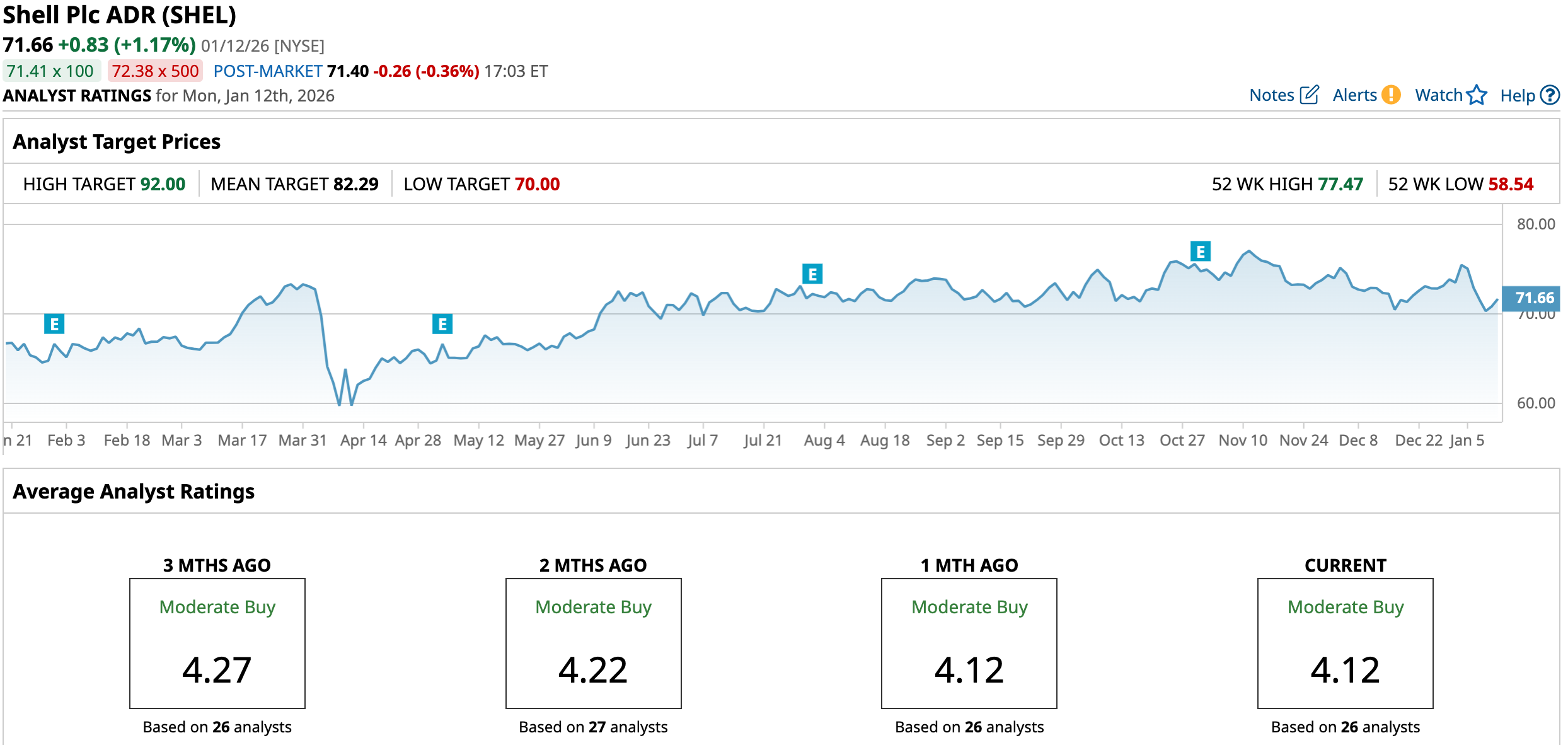 Wall Street is leaning bullish on Shell, with the stock carrying a “Moderate Buy” consensus rating that reflects growing confidence in its outlook. Out of 26 analysts covering the stock, 13 rate it a “Strong Buy,” three call it a “Moderate Buy,” and just 10 remain on the sidelines with a “Hold.” The numbers also point to solid upside ahead. The average price target of $82.29 suggests Shell could climb 13.44%, while the most optimistic target of $92 implies a nearly 28.38% rally from current levels.