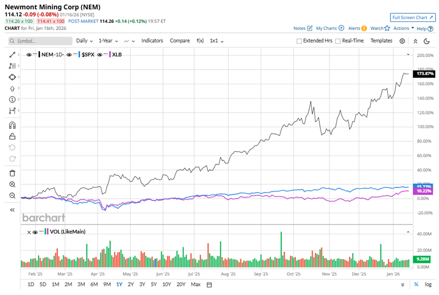 NEM stock has significantly outperformed the S&P 500 Index’s ($SPX16.9% gains over the past 52 weeks, with shares up 174% during this period. Similarly, it considerably outperformed the Materials Select Sector SPDR Fund’s (XLB10.9% gains over the same time frame.