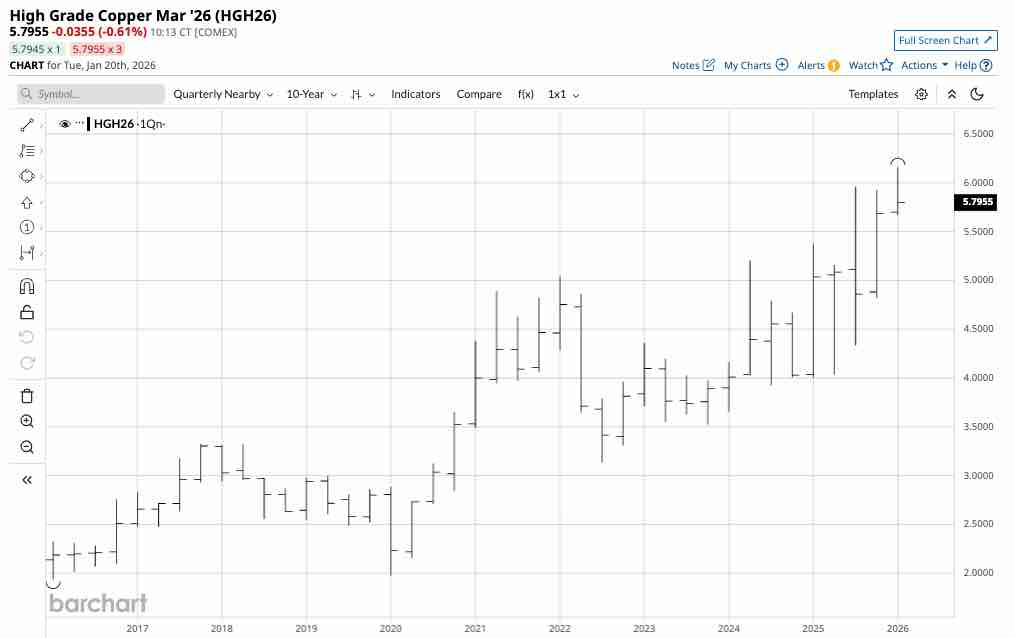 The quarterly chart highlights that the continuous COMEX copper future posted a 41.12% 2025 gain, with the futures settling at $5.6820 per pound on December 31, 2025.