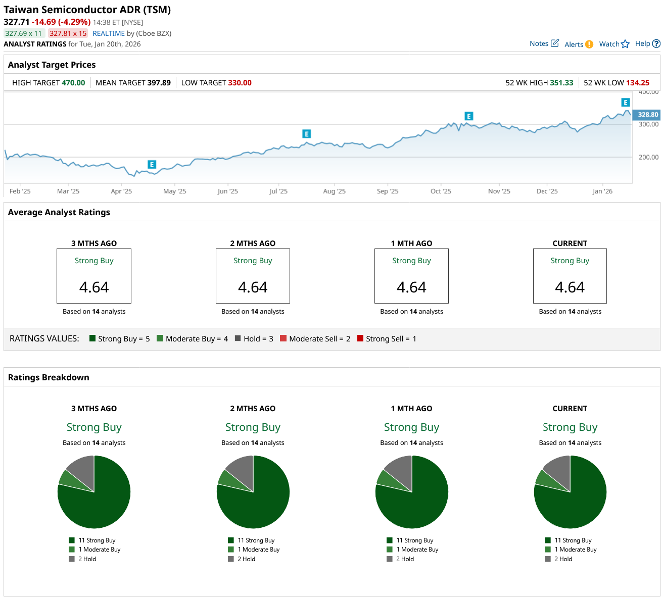 Wall Street analysts have a consensus rating of “Strong Buy” on TSM stock, reflecting strong optimism about the company’s growth prospects. Out of the 14 analysts covering the stock, 11 recommend a “Strong Buy,” one suggests a “Moderate Buy,” and two advise holding. The average price target for TSMC stock stands at $382.33, implying an 17% upside potential from current levels.