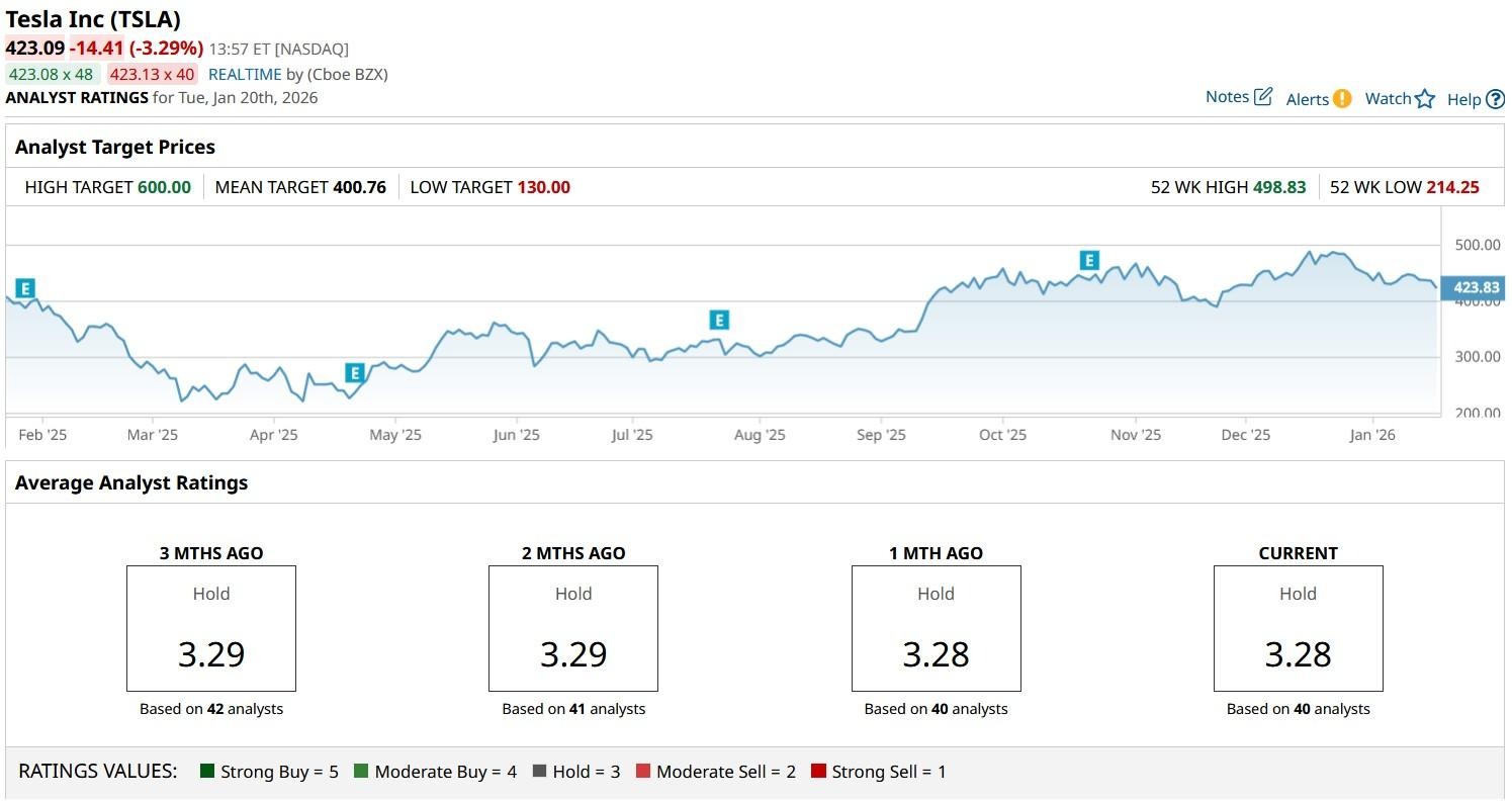 The consensus rating on Tesla stock remains at “Hold” only with the mean target of about $401 indicating potential downside of more than 5% from here.