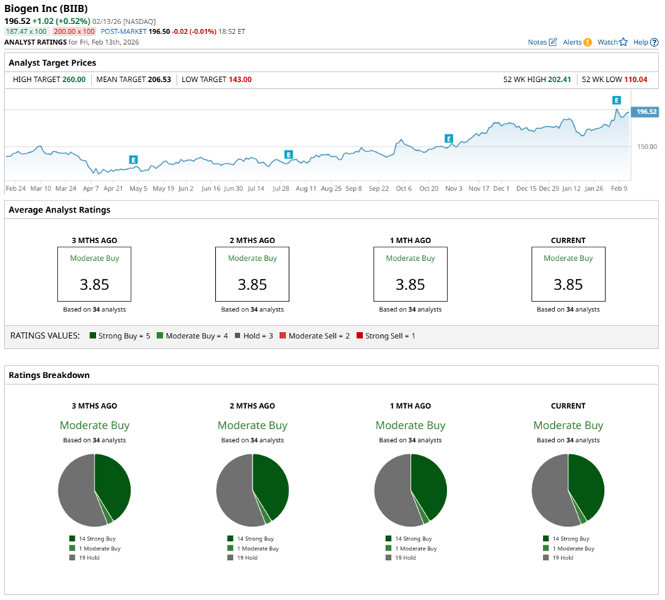 Wall Street currently assigns BIIB an overall rating of “Moderate Buy.” Among 34 analysts covering the stock, 14 recommend “Strong Buy,” one suggests “Moderate Buy,” and 19 advise “Hold.”