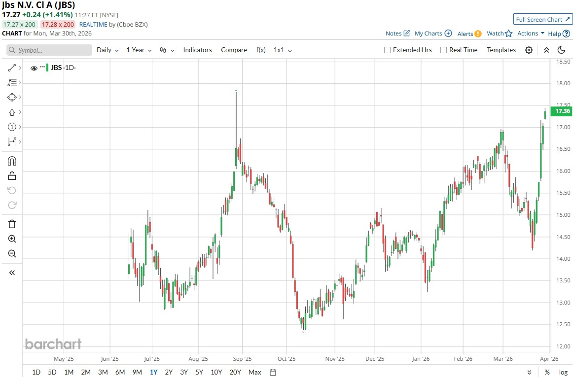 JBS stock sits near the $18 level as of this writing, up 26% year-to-date (YTD) and 23% over the last six months. JBS was first approved for trading on the New York Stock Exchange (NYSE) in May 2025.