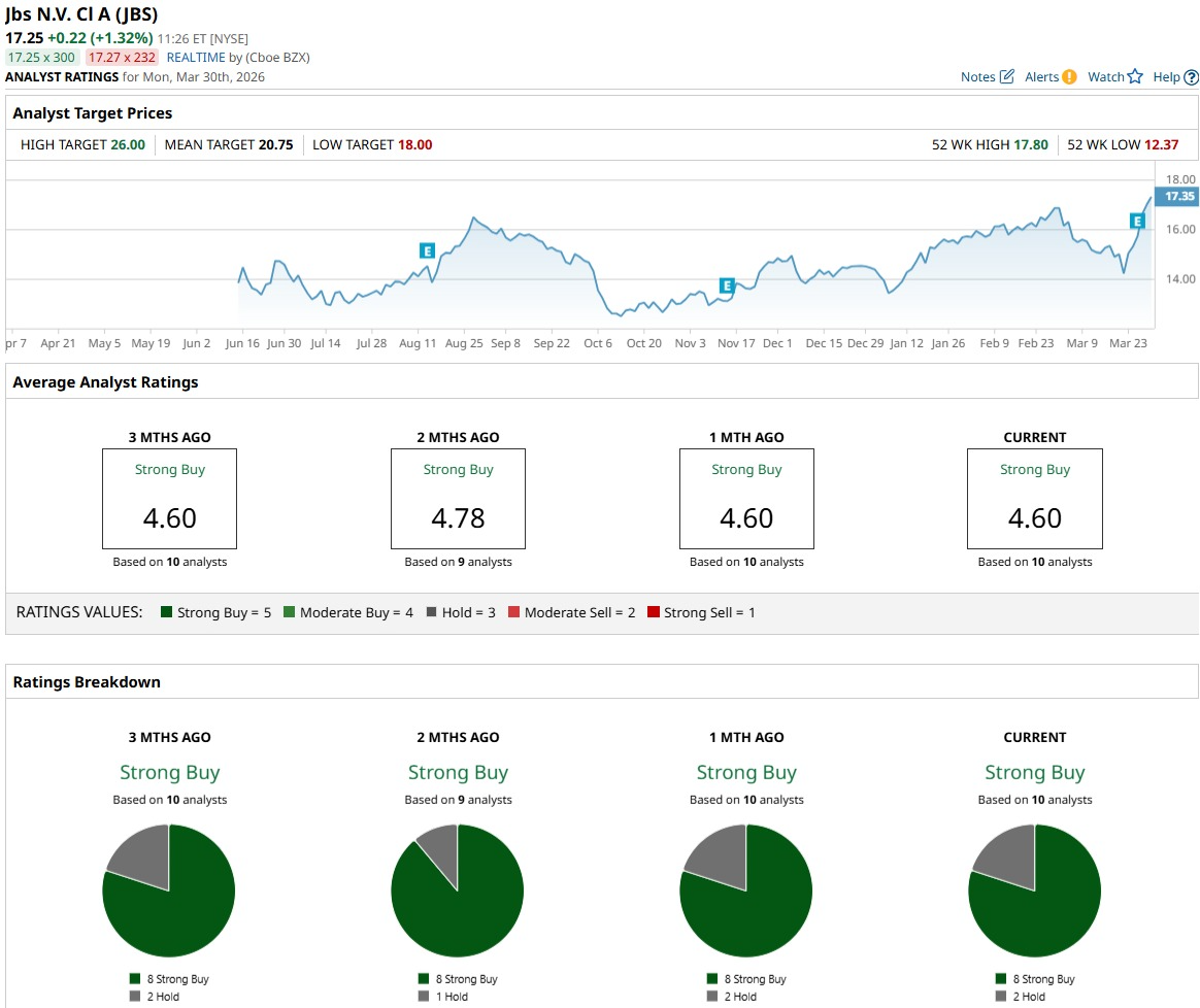 In October 2025, BMO Capital published a call on JBS stock, with analyst Andrew Strelzik reiterating a “Buy” rating and setting a price target of $17. That target has already been met and slightly exceeded.