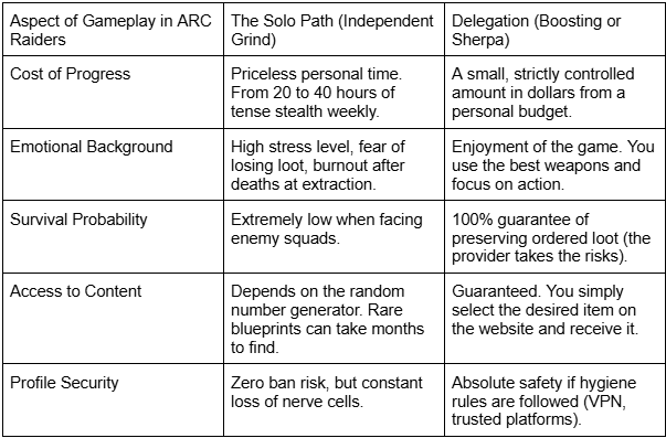 The rational decision to buy ARC Raiders boosting for a conditional $20 or $40 from your entertainment budget is a mathematically calculated investment. You literally buy back 30 hours of your life. That time can be spent with your loved one, on work projects, or getting proper sleep. And in the evening, launching the game, you immediately pick up a fully modified sniper rifle and get pure adrenaline from PvP battles without worrying that you’ve run out of resources to craft basic medkits.