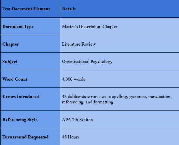 Most proofreading service reviews assess quality subjectively. We took a different approach entirely. We prepared a real Master's dissertation chapter and deliberately introduced a specific number of errors across all five proofreading areas. We then submitted it to Affordable Dissertation UK and tracked exactly which errors were caught and which were missed.