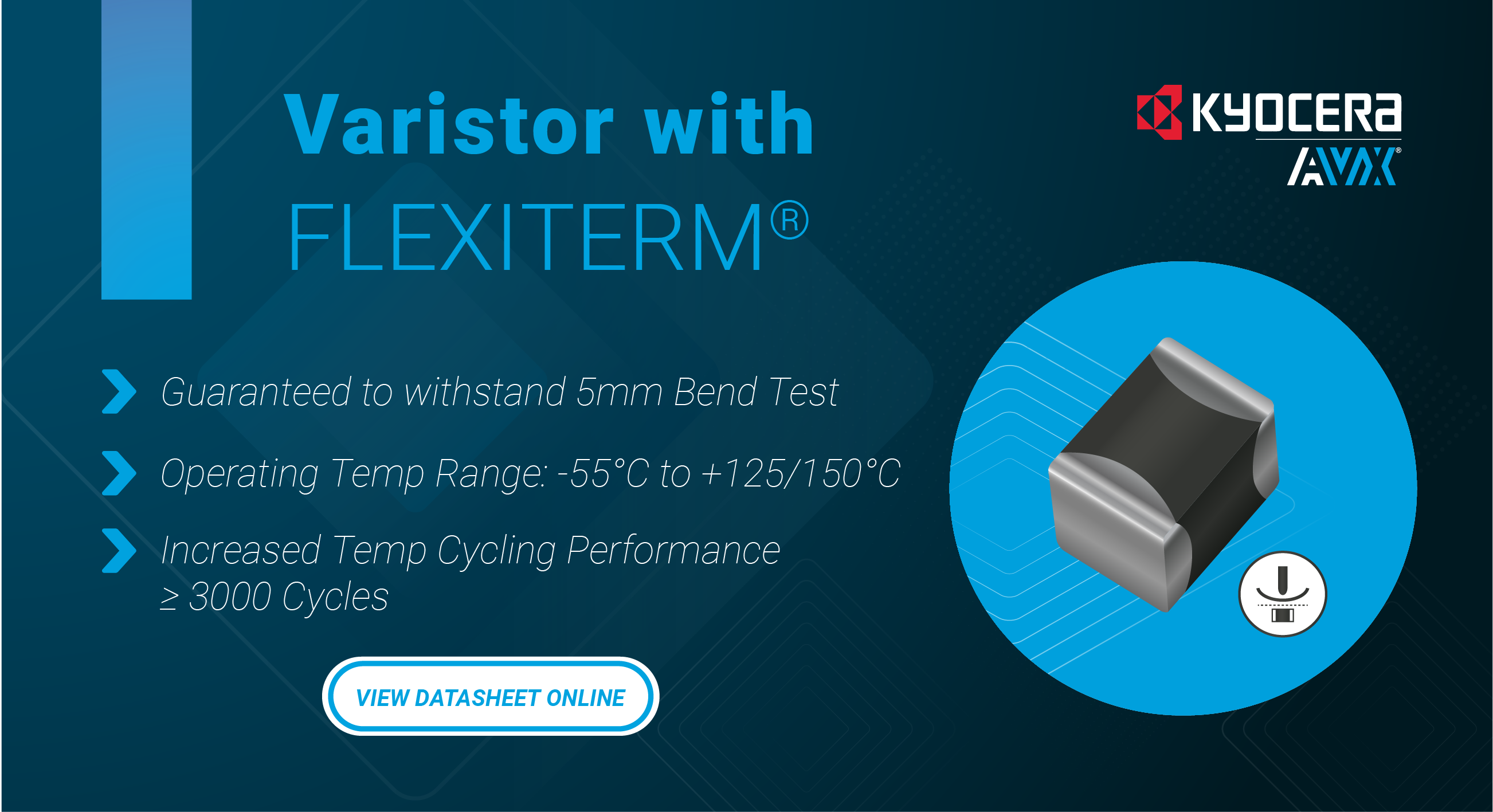 FOUNTAIN INN, S.C., Oct. 03, 2022 (GLOBE NEWSWIRE) -- KYOCERA AVX, a leading global manufacturer of advanced electronic components engineered to accelerate technological innovation and build a better future, has released the industry’s first automotive-qualified multilayer varistors (MLVs) equipped with the company’s patented FLEXITERM® soft termination technology, which has been widely employed on a number of automotive-qualified multilayer ceramic capacitors (MLCCs) for more than 15 years. Designed to satisfy automotive industry demands for more robust component solutions, the new VCAS Series MLVs with FLEXITERM technology are engineered to reliably withstand severe flexing, vibration, and temperature cycling, enabling up to 5mm of mechanical board flexure over 3,000 temperature cycles extending up to 150°C with zero board flex failures, including internal cracks and depanelization, and no significant changes to electrical characteristics. Automotive-qualified MLVs with industry-standard terminations, on the other hand, generally support just 2mm of board flexure over 1,000 temperature cycles extending up to 125°C, which is often insufficient for preventing flex failures cause by the mechanical and thermal stresses incurred during assembly and operation.