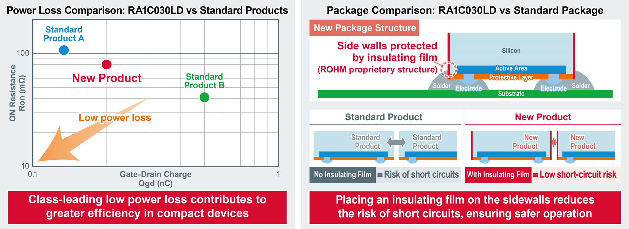 The RA1C030LD is offered in the DSN1006-3 wafer-level, chip-size package (1.0mm × 0.6mm) that takes advantage of ROHM’s proprietary IC process to achieve low power dissipation together with greater miniaturization. In terms of the figure of merit that expresses the relationship between conduction and switching losses (ON resistance × Qgd), an industry-leading value has been achieved that is 20% lower than standard package products in the same package (1.0mm × 0.6mm or smaller), contributing to a significantly smaller board area, along with higher efficiency in a variety of compact devices. At the same time, ROHM’s unique package structure provides insulated protection for the side walls (unlike standard products in the same package with no protection). This reduces the risk of short-circuit due to contact between components in compact devices that must resort to high density mounting due to space constraints, contributing to safer operation.