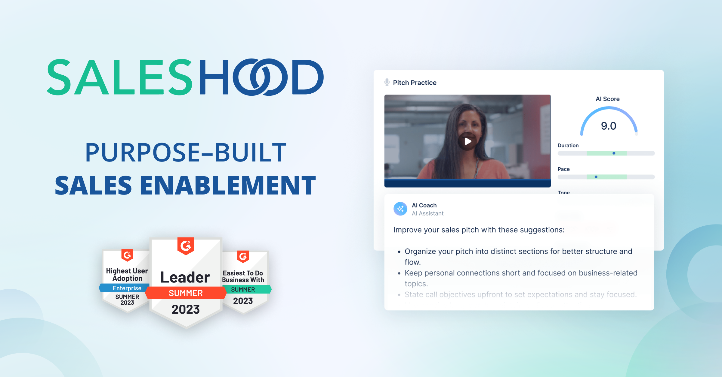 San Francisco, California, Aug. 03, 2023 (GLOBE NEWSWIRE) -- SalesHood, the leading purpose-built sales enablement platform, launched AI coach to augment its world-class sales training and certification applications. AI Coach uses generative AI technology to scale readiness, effectiveness and execution by efficiently keeping teams in sync and aligned with the latest messaging. All customer-facing employees across the customer journey use AI Coach to uplevel what they say and how they say it.