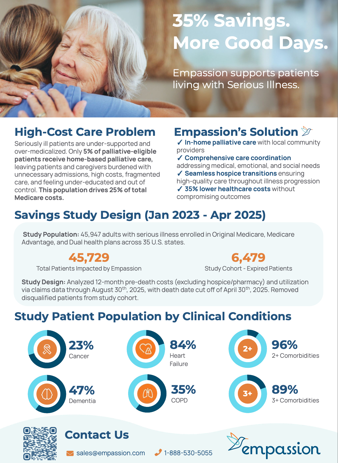 Empassion’s unique model provides in-home palliative care through local community providers, comprehensive care coordination that addresses medical, emotional, and social needs, and seamless hospice transitions. The Savings Study analyzed claims data from 45,947 adults with serious illness enrolled in Original Medicare, Medicare Advantage, and Dual health plans across 35 states.