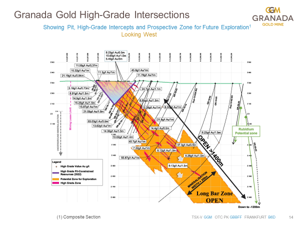 The Granada Shear Zone and the South Shear Zone contain, based on historical detailed mapping as well as from current and historical drilling, up to twenty-two mineralized structures trending east-west over five and a half kilometers. Three of these structures were mined historically from four shafts and three open pits. Historical underground grades were 8 to 10 grams per tonne gold from two shafts down to 236 m and 498 m with open pit grades from 3.5 to 5 grams per tonne gold.