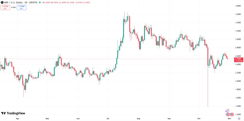The price range for October 30, 2025, is from around $2.52 to $2.66, with the coin attempting to keep its upward trend against the sellers but failing.