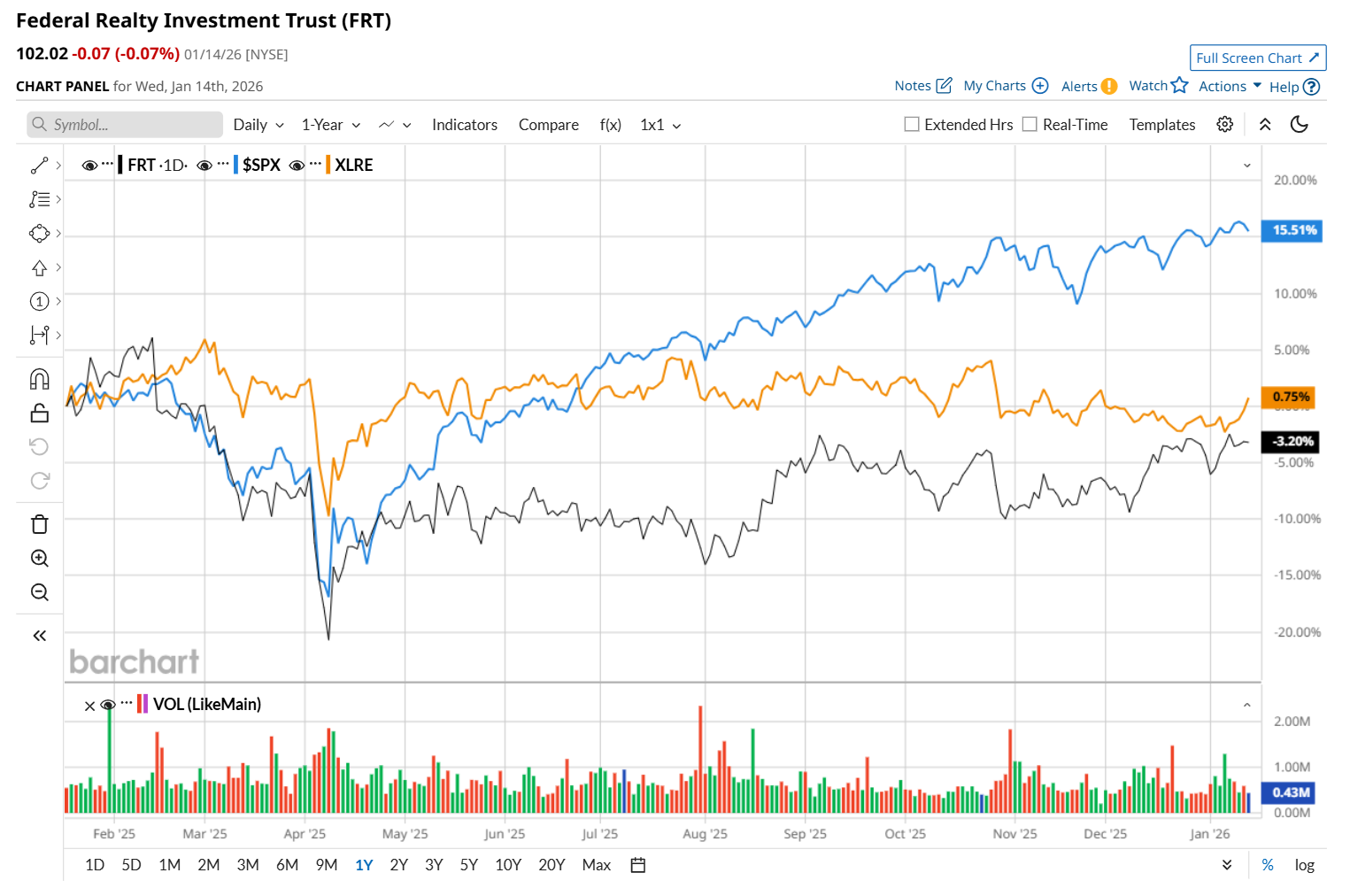 FRT has declined 1.9% over the past 52 weeks, lagging behind both the S&P 500 Index's ($SPX) 18.6% return and the State Street Real Estate Select Sector SPDR ETF’s (XLRE) 3.4% uptick over the same time period.