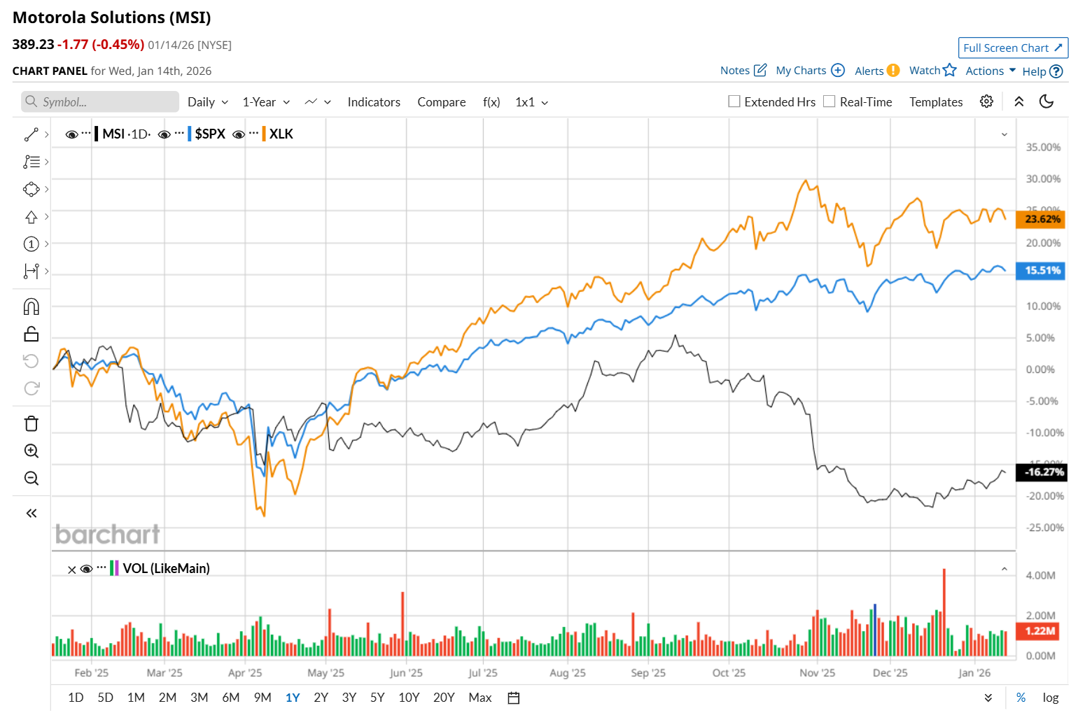 MSI has declined 15.5% over the past 52 weeks, notably underperforming both the S&P 500 Index's ($SPX) 18.6% return and the State Street Technology Select Sector SPDR ETF’s (XLK) 27.1% uptick over the same time period.