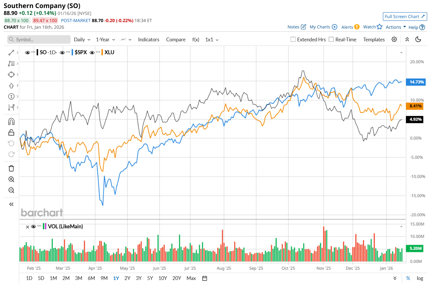 SO has gained 6% over the past 52 weeks, underperforming both the S&P 500 Index's ($SPX) 16.9% return and the State Street Utilities Select Sector SPDR ETF’s (XLU) 10.2% uptick over the same time period.