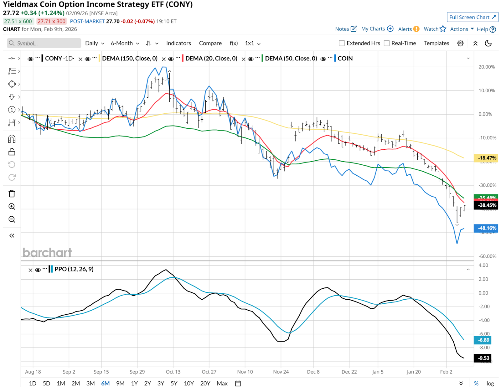 Here’s a covered-call ETF, Yieldmax Coin Option Income Strategy ETF (CONY), which tracks Coinbase (COIN) stock. And that’s the problem. It touts a yield of nearly 20%. But that gets erased when the underlying stock falls — such as when COIN’s price was cut in half over the past six months, even after an initial 20% pop higher.