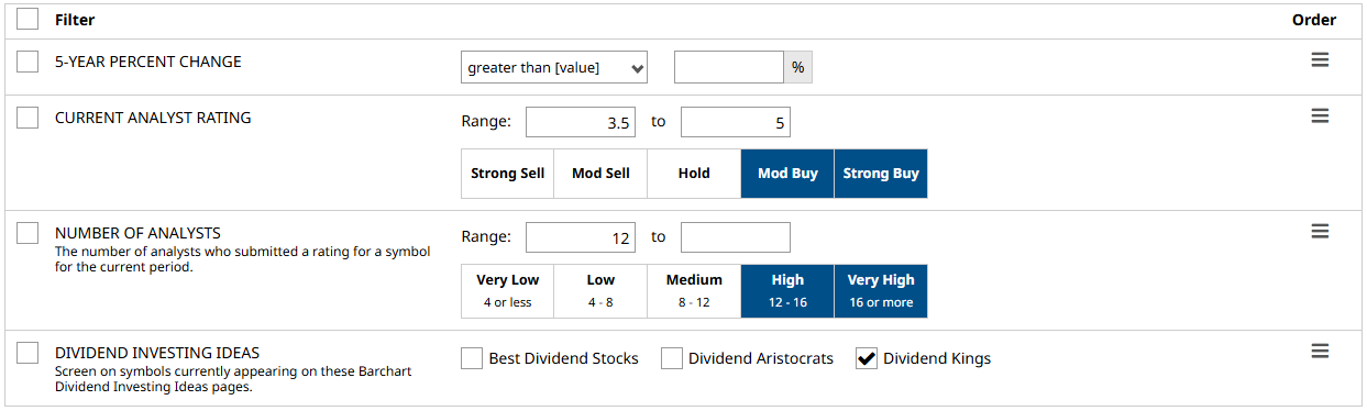 Using Barchart’s Stock Screener, I selected the following filters to get my list:
