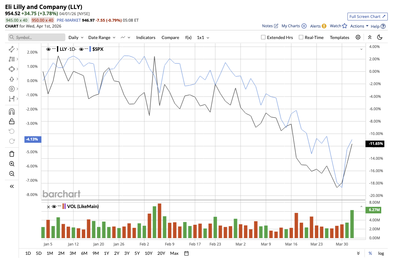 Valued at $901.8 billion, LLY stock has fallen 12% year-to-date (YTD), compared to the S&P 500 Index’s ($SPX) dip of 4%.