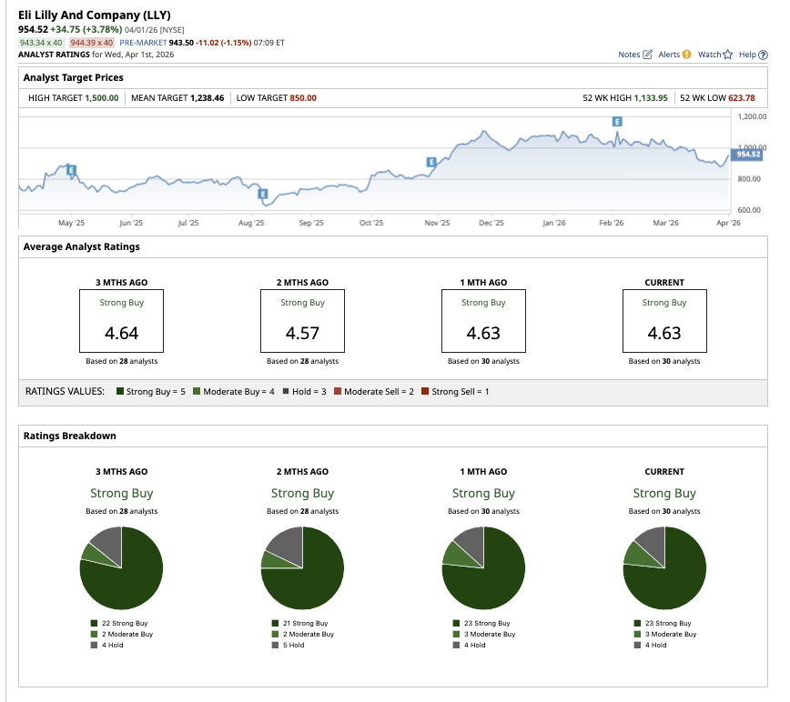 On Wall Street, Eli Lilly has earned an overall “Strong Buy” rating. Of the 30 analysts who cover the stock, 23 rate it a “Strong Buy,” three rate it a “Moderate Buy,” and four recommend a “Hold.” The average analyst price target of $1,238.46 suggests a 30% increase from current levels. Furthermore, the Street-high estimate of $1,500 implies that the stock could rally by up to 57% over the next year.