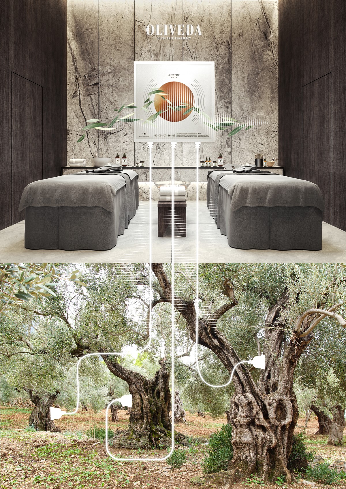 This worldwide unique olive tree sound bath which connects the spas directly and in real time with the healing mountain olive trees can be offered exclusively in 3,875 U.S. certified spas.