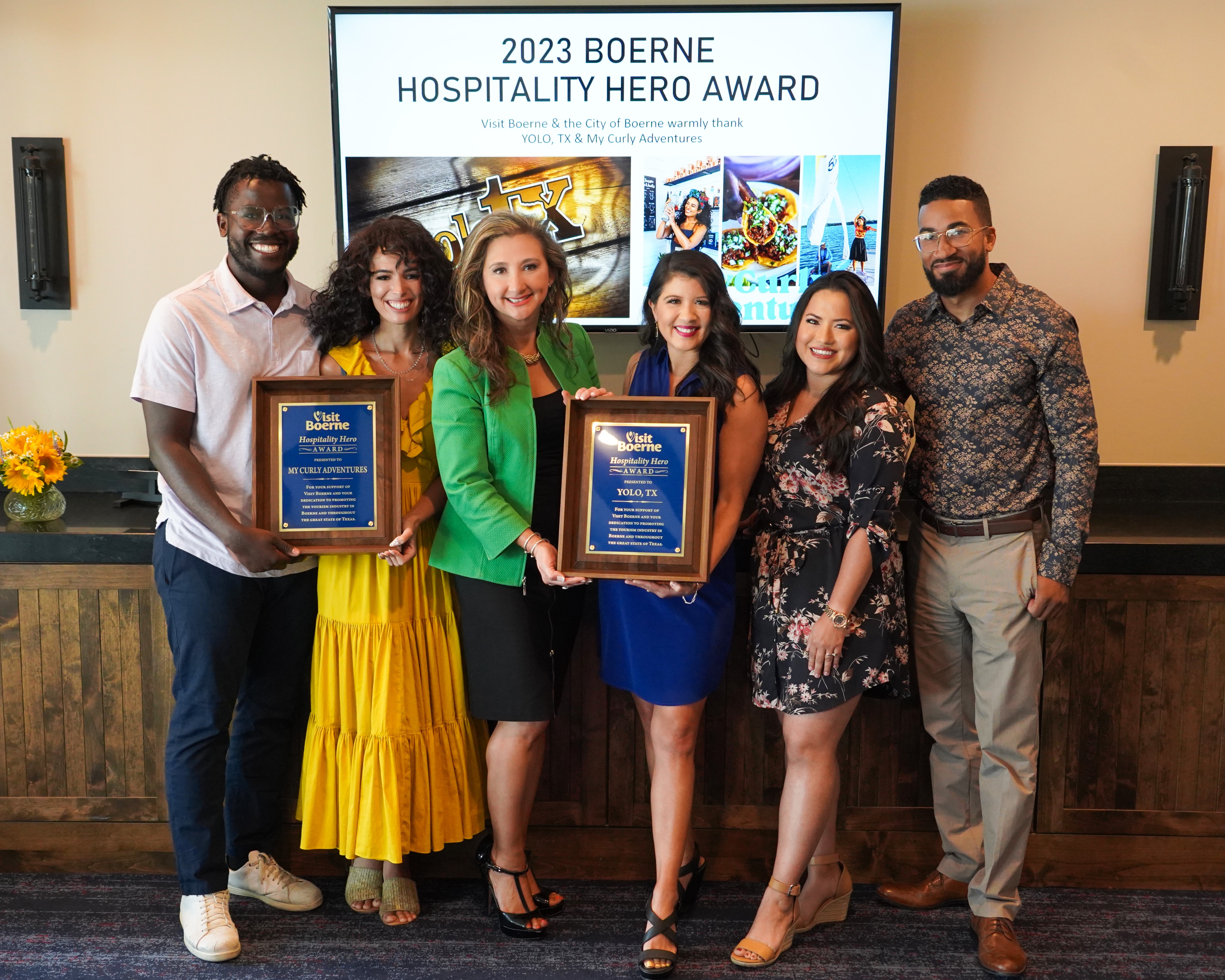 At a luncheon on Wednesday, May 10th, at The Bevy Hotel in Boerne, TX, members of the Visit Boerne team bestowed a Hospitality Hero Award plaque each to YOLO TX and My Curly Adventures in appreciation for their ongoing relationship and partnership in promoting Boerne Texas as an elevated Hill Country experience for all travelers to enjoy. “Their continued support has substantially aided in putting Boerne, TX, on the map as an exciting travel destination for visitors across the globe,” said Larry Woods, Visit Boerne Director.
