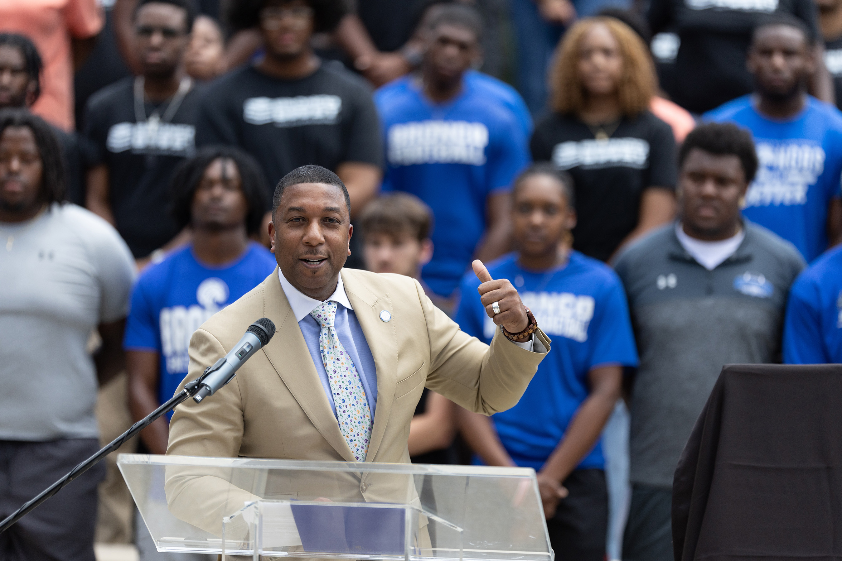 The large crowd also heard about the successes and accomplishments since launching the Free Summer School Program, like first-time freshmen retention rate. “Our one-year retention rate for first-time freshmen cohorts in fall 2020 was 63.3%,” Associate Vice Chancellor for Student Success & Enrollment Management Pamela Baldwin, Ed.D., said during the event. “In fall 2021, we saw an increase to 69.7%. Fall 2022, another increase to 77.7%, and I am excited to share we project another increase for fall 2023.”