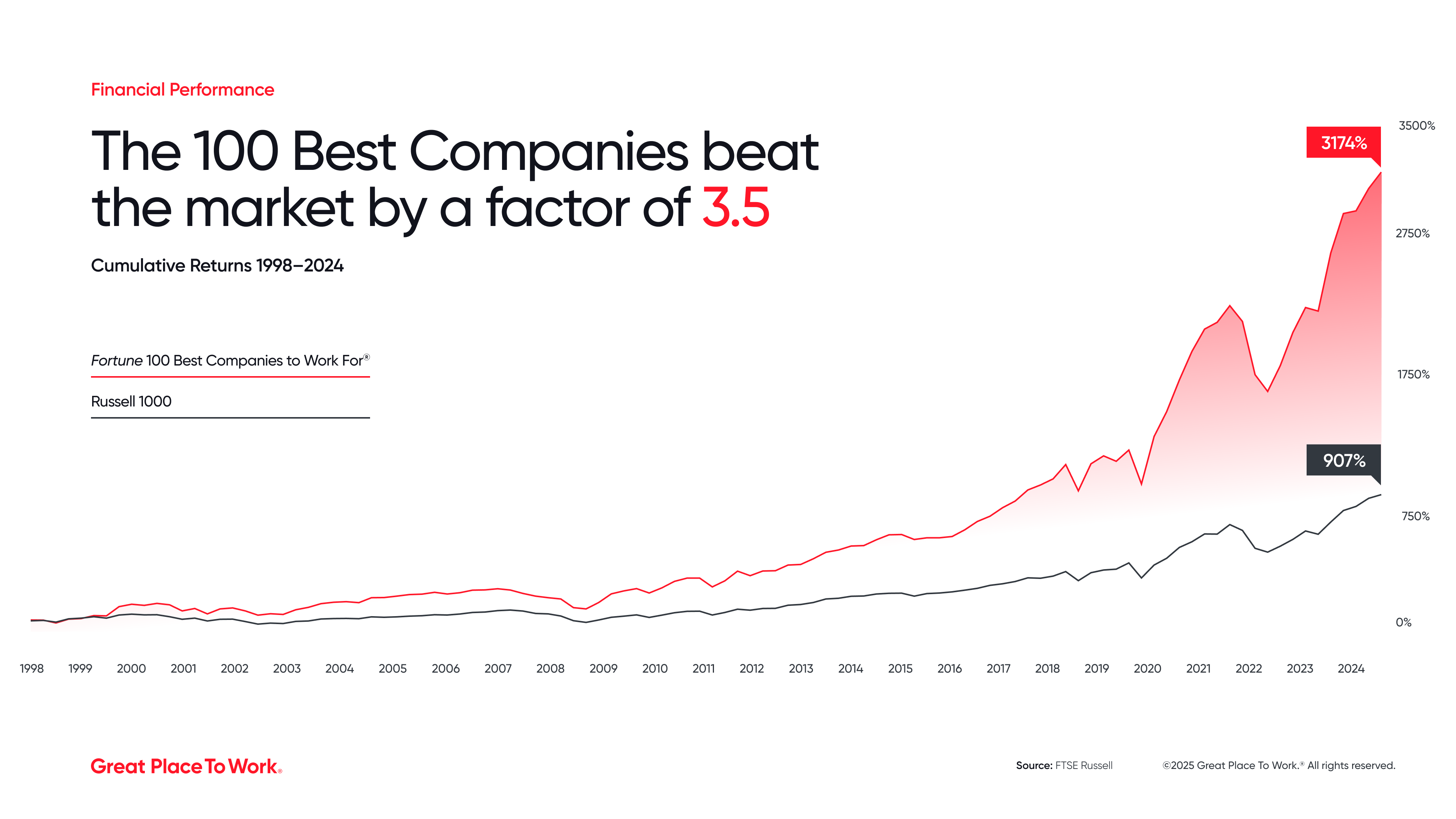 Historic analysis confirms outperformance isn’t just a snapshot in time. The 100 Best Companies achieved a total return of 3,174% compared to the 907% total return of the Russell 1000 Index from December 1997 to December 2024.