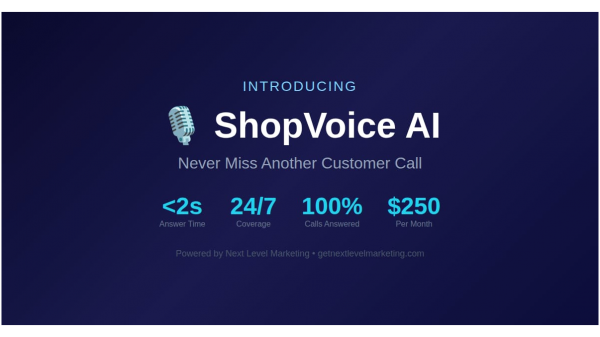 -- Leesburg, VA — March 25, 2026 — Get Next Level Marketing (getnextlevelmarketing.com) today announced the launch of ShopVoice AI, an AI-powered phone answering system built specifically for auto repair shops. The service tackles a critical industry problem: the average auto shop loses an estimated $135,000 per year from unanswered customer calls.