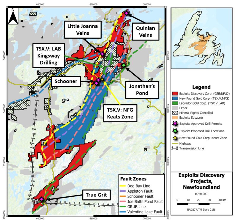 Michael Collins, President and Chief Executive Officer of Exploits, commented: “With the drill permit now secured for our Quinlan Vein prospect, Exploits is pleased to now have received four of its five drill applications. The Quinlan Vein prospect is an impressive piece of land with high grade, visible gold samples at surface and we are looking forward to unlocking its potential with the drill. Our 2021 exploration plans are taking shape with boots on the ground work to refine these targets, culminating in our Phase I drill campaign in May.”
