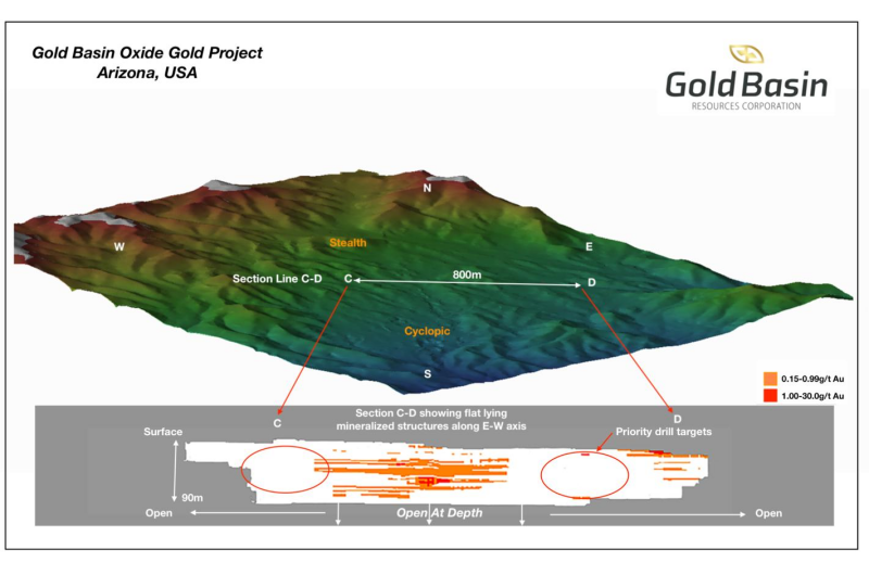 July 12, 2021 - TheNewsire - Vancouver, British Columbia - Gold Basin Resources Corporation (the "Company" or "Gold Basin") (CNSX:GXX.CN) (OTC:GXXFF) announces the completion of 3D modelling of the mineralised structures at the Cyclopic deposit located within its 100%-owned Gold Basin oxide gold project, located in north-western Arizona (the "Gold Basin Project" or the "Project").